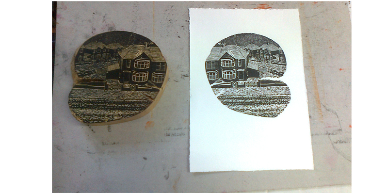 A reductive lino-print is where you re-print another colour over the previous print after cleaning and cutting away a bit more of the lino. This is then repeated several times to build up the picture. The print becomes unique not only from the variations with each print, but because you have physically cut away the previous image to print the next colour.